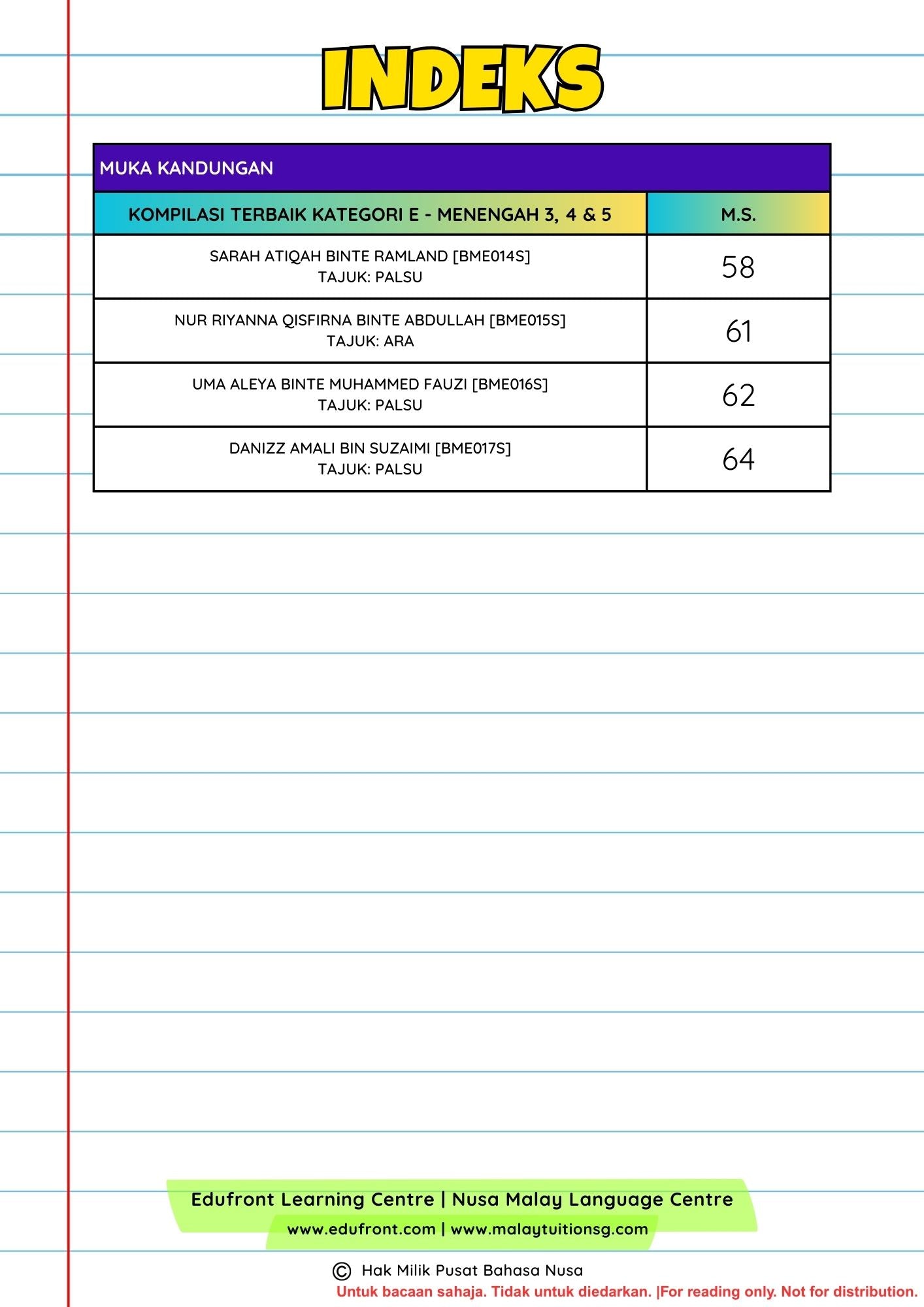 If you are a Saya Boleh Mengarang participant redeeming your complimentary copy using a unique code and encounter issues, please contact our Competition Manager, Ms Sulastri, at [nusa@edufront.com] with your registered participant code for verification.