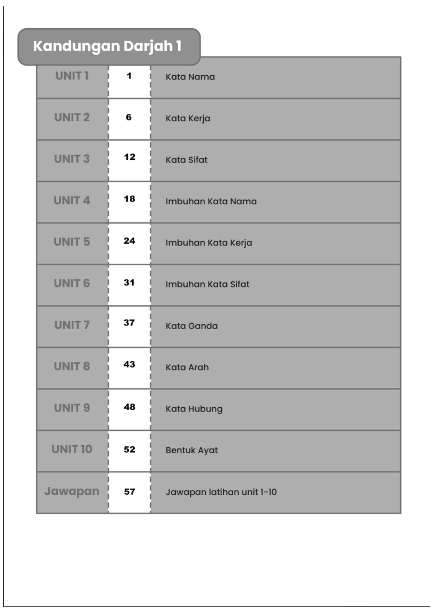 The aim of this book is to facilitate the process of teaching and learning Malay grammar for Malay language students This Perkasa Bahasa Primary 1 book is suitable for mastering P5 students’ Malay grammar skills. With 10 units of varied grammar topics, students will be able to strengthen their grammar acquisition. Each unit features grammar notes that are accompanied by exercises.